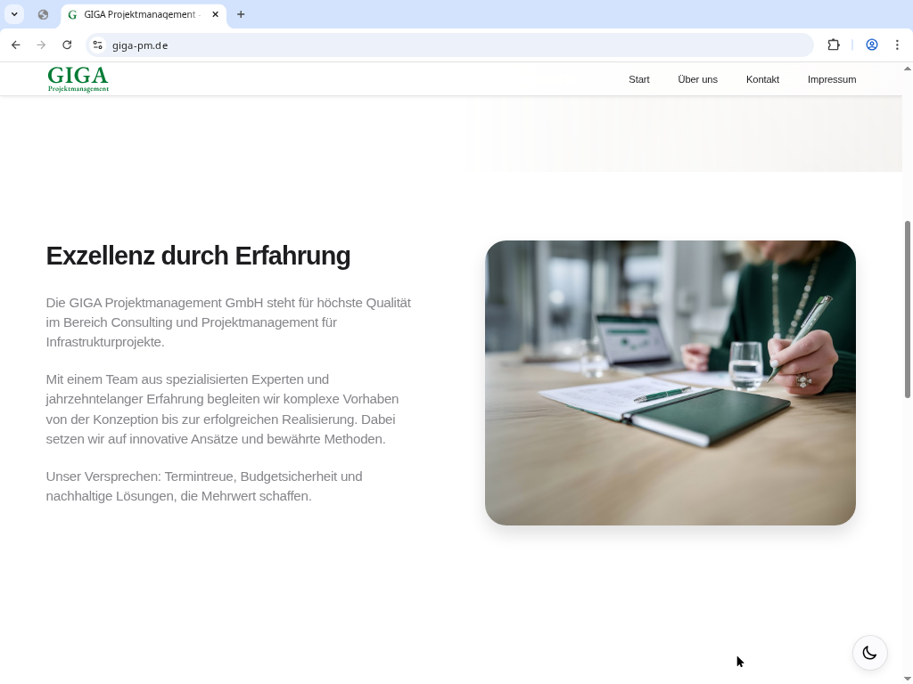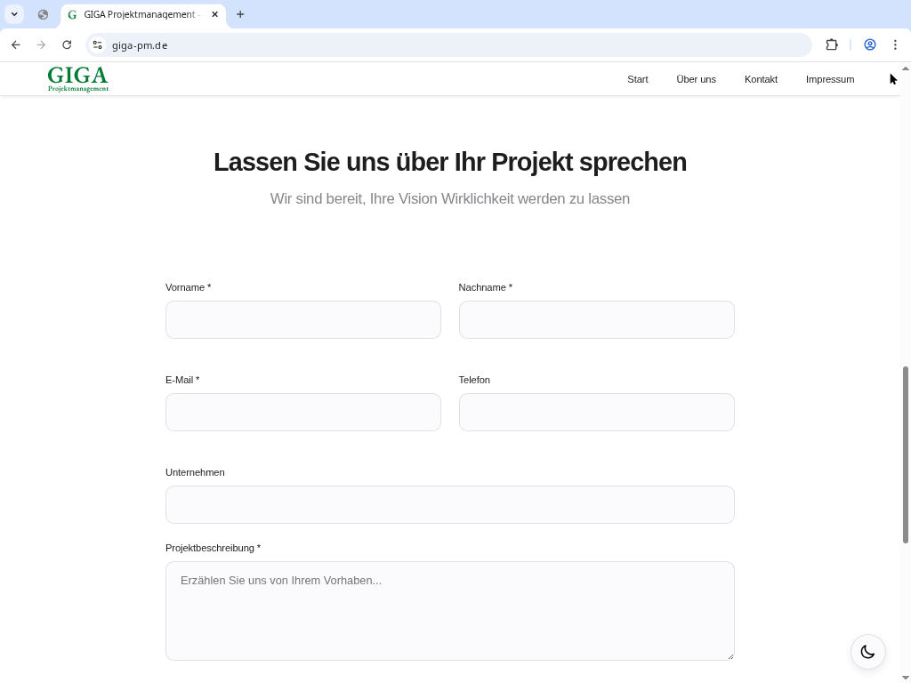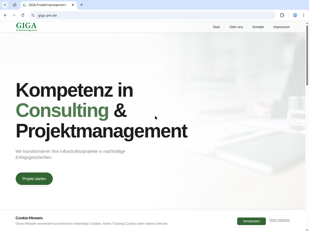 For GIGA Projektmanagement GmbH, a modern and highly functional corporate website was created that conveys professionalism and trust. The goal was to build a clear, minimal yet distinctive online presence that directly reflects the company’s expertise in consulting and project management — combined with intuitive access to service and contact sections.